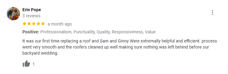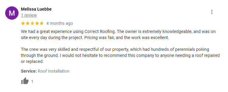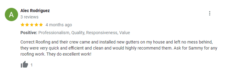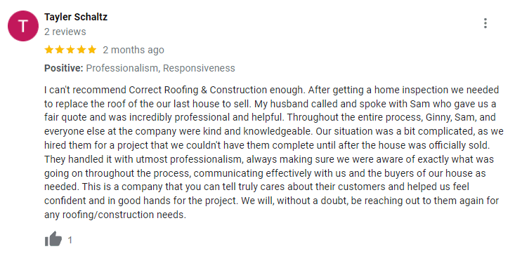 Posted on F.I. B.Trustindex verifies that the original source of the review is Google. Did right by me. A windstorm caused leaks on my 23 year old roof. Sammy and his crew came right out on short notice. He stood firm behind his word and his work.Posted on Melissa WickTrustindex verifies that the original source of the review is Google. Quick to respond to our needs, professional and courteous staff. The quality of the final product meets our highest standards.Posted on Avis MinorTrustindex verifies that the original source of the review is Google. Correct roofing was great their staff was very professional. They made sure i got the best roof for my budget and also added some preventative maintenance features to keep my roof lasting for a long time. They really care about their customers! Couldn't ask for a better deal. Thanks!Posted on Dan DTrustindex verifies that the original source of the review is Google. Our family is highly satisfied with the attention to detail that Correct Roofing poured into restoring our home. Correct Roofing definitely takes pride in the work that they do. Moreover, it was clear throughout the entire process on what type of work was optional but optimal to have our home be the most efficient in terms of energy savings and protection from the elements. Lastly, all our concerns as work was completed were addressed even if it was them adding to our understanding of how certain fixes were done and why. First speaking to their attention to detail. We hired Correct Roofing after they were highly recommended by one of our family members. Our home was damaged after a week-long exposure to wind, hail and rain. My wife and I noticed damage to the ceiling of our nursery. I had four different contractors review the damage, but most did not want to review the home for further damage until our insurance company approved a claim. Except for Sam from Correct Roofing. Sam was the only person that crawled through the attic with me to review other parts of the home for other hidden parts that were damaged because of the storm. Sam also walked me through the entire house and explained to me how the claim process typically works in language that I could understand. Throughout the process I felt that his team were also advocates in providing small details that gave it a human touch. For example, they installed trim around the attic access and the skylights. These were small items that weren’t asked for but very much appreciated to increase the aesthetic appeal of our home. Thank you so much Correct Roofing for those small details. Secondly, it was my experience that the team at Correct Roofing did an excellent job at communicating throughout the entire process. I was clear on what work was going to be done and when it was going to be done. Also, I was very aware of what work was covered and what work would be ideal for our home to be at its optimal performance. For example, one thing I did not know before the start of the project was how baffles worked and why they were important. Sam fully explained the benefits of having baffles but also gave me the time and the choice to have them installed as they were not covered by insurance. We ended up paying for the baffles because we believed it would be beneficial to have them installed but we always felt empowered that we knew we had a choice in installing them or not. This is one of several examples of how well they communicated to us throughout the process and how we always felt the power to choose. In the end, our house feels warmer both physically and emotionally because of the consultative approach Correct Roofing provided us with. Lastly, it’s refreshing to know that people take pride in their work. For example, when the siding was replaced on the garage there was an accidental nail nick on wiring to one of the lamps which caused a loss of power to the garage. When I mentioned it to Sam, he quickly sent Don over to fix the issue. Not only did he happily fix it, Don also took the time to teach me how the electricity was wired. I mention this because now I know how to trouble shoot electrical problems which is valuable as a homeowner. Furthermore, I also had a concern with water leaking from the siding. When I mentioned it to Ginny, she quickly paged the contractor who was going to be on site anyway. They took the time to pull the siding to show me that it was completely dry, and the siding was doing its job. I now know that siding has what’s called weeping holes which is useful to release any moisture away from the home. In our case, the moisture was caused because that part of the house is near our laundry room which is creating some moisture but is being released by the siding.